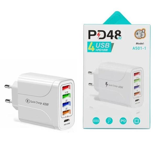 ŁADOWARKA SIECIOWA 5A BIAŁA VEGA FASTON 48W FAST CHARGER 2400mA SINGLE 4XUSB 1XPD 18W